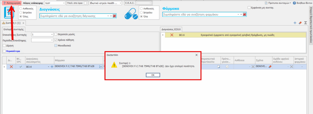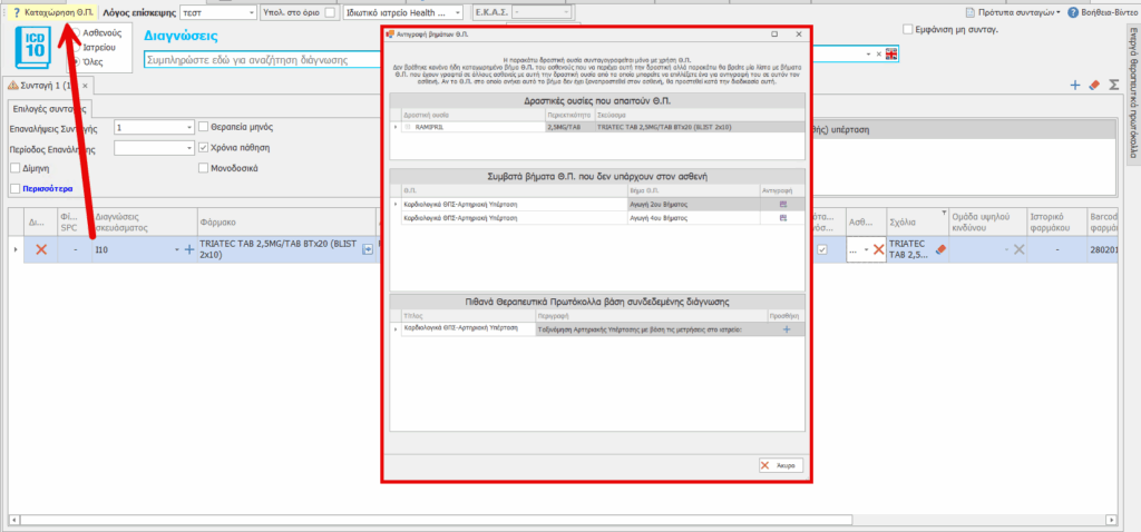 Όταν κάποιο επιλεγμένο σκεύασμα χρειάζεται Θεραπευτικό Πρωτόκολλο, η καταχώριση εμφανίζεται με πορτοκαλί χρώμα. Επιλέγοντας την καταχώριση: